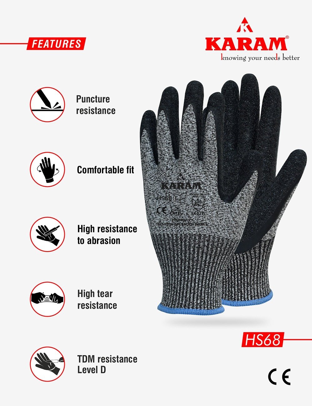HS 68 safety gloves combine a durable HPPE/glass liner with a crinkle-finished latex coating for exceptional grip and protection. Offering high resistance to abrasion, puncture, and tear, these safety gloves ensure comfort, style, and performance, making them perfect for industrial and mechanical applications where safety is non-negotiable.
