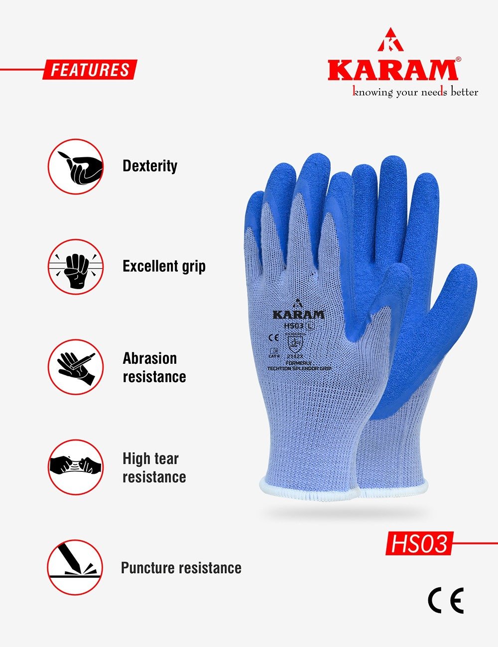 The HS 03 Polyester Liner with Natural Latex Coating – Blue is a premium pair of safety gloves designed for comfort, durability, and excellent grip. Featuring a crinkle latex coating and a high-density polyester liner, these gloves offer top-tier protection against abrasion and tears. Ideal for industrial and handling tasks, they combine performance with aesthetics, thanks to their unique brown and black design. These safety gloves are a dependable choice for anyone seeking reliable and comfortable hand protection.
