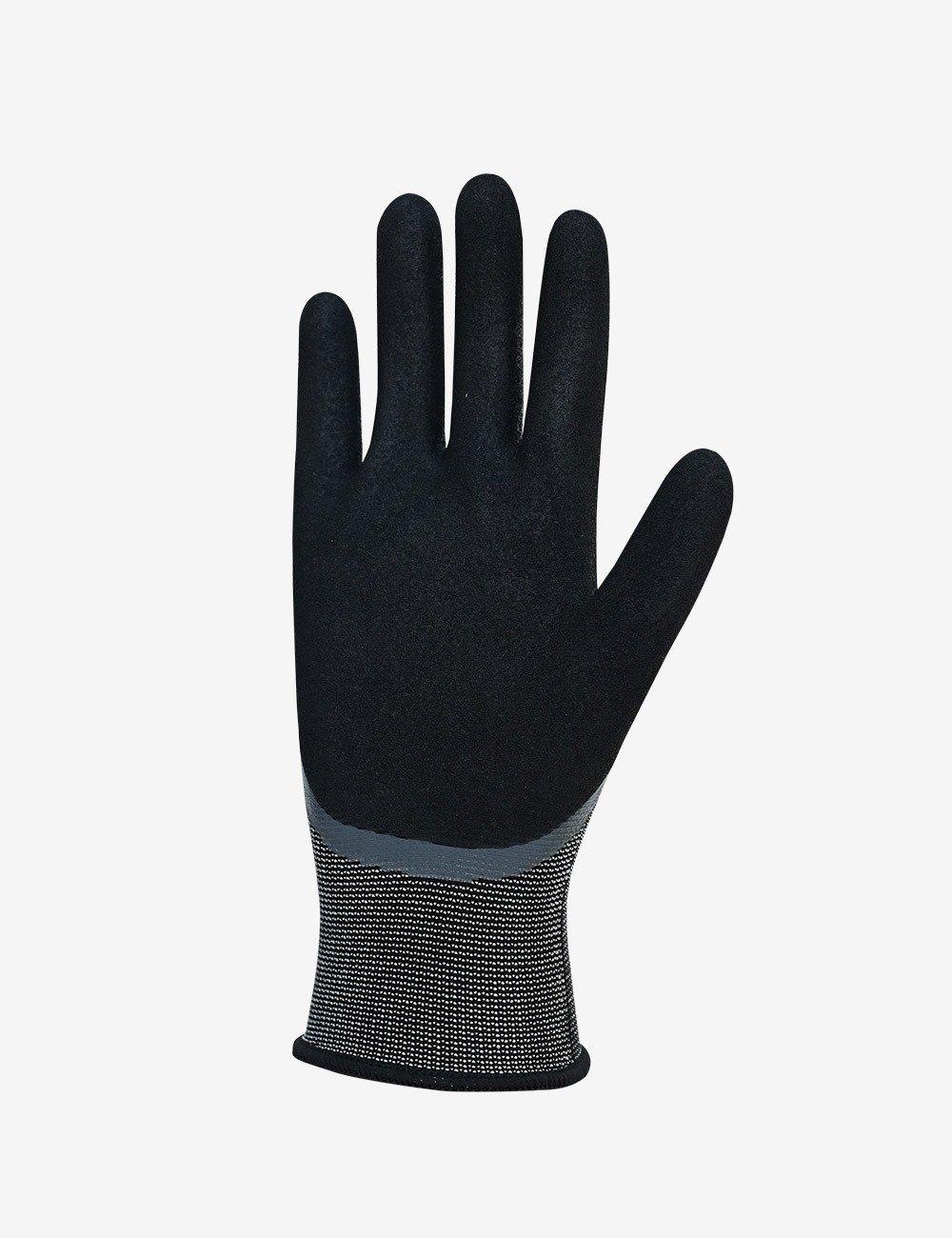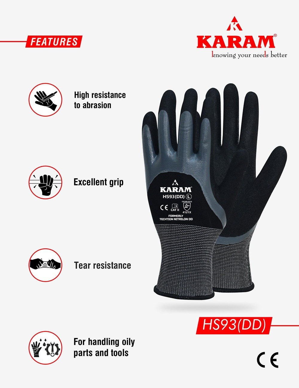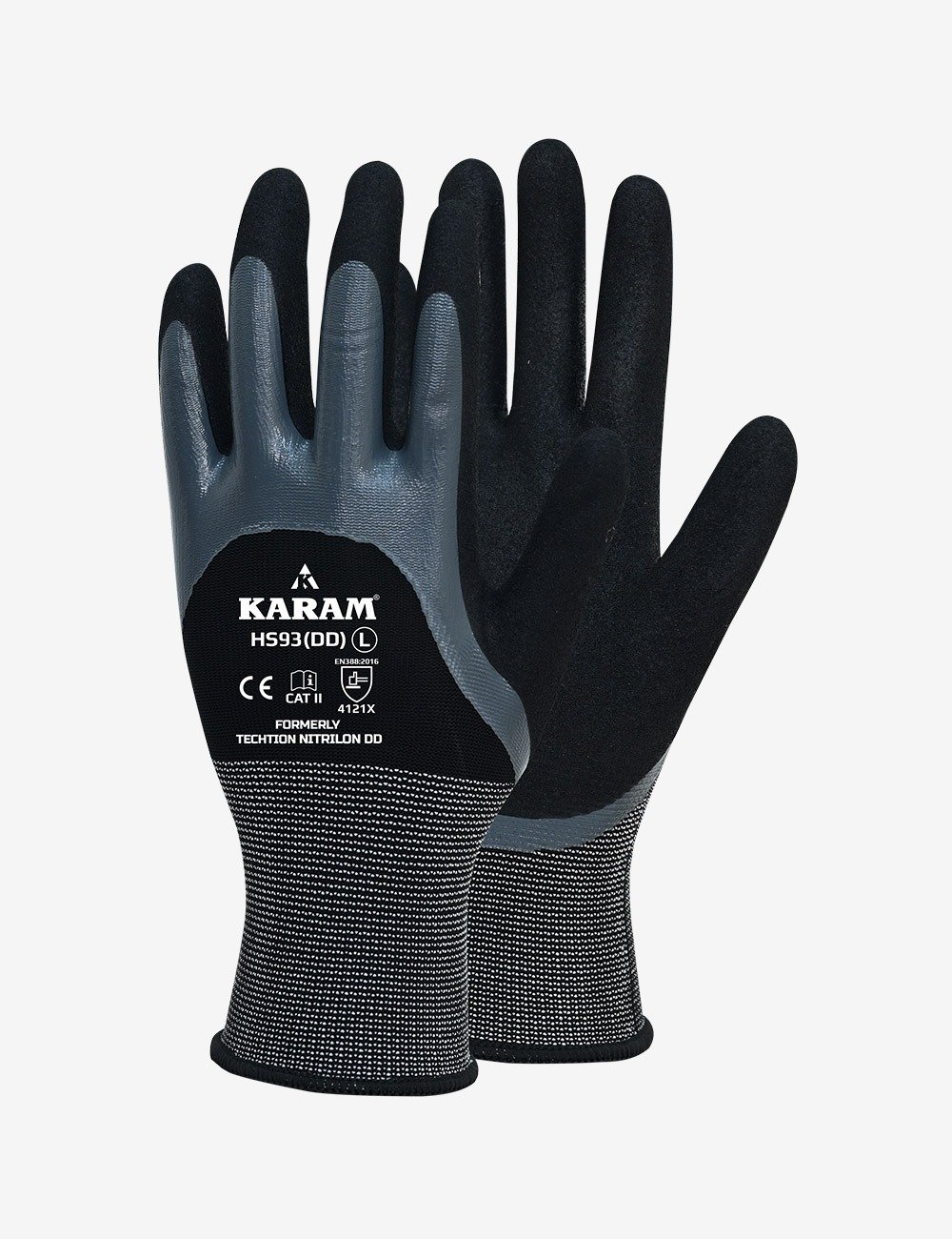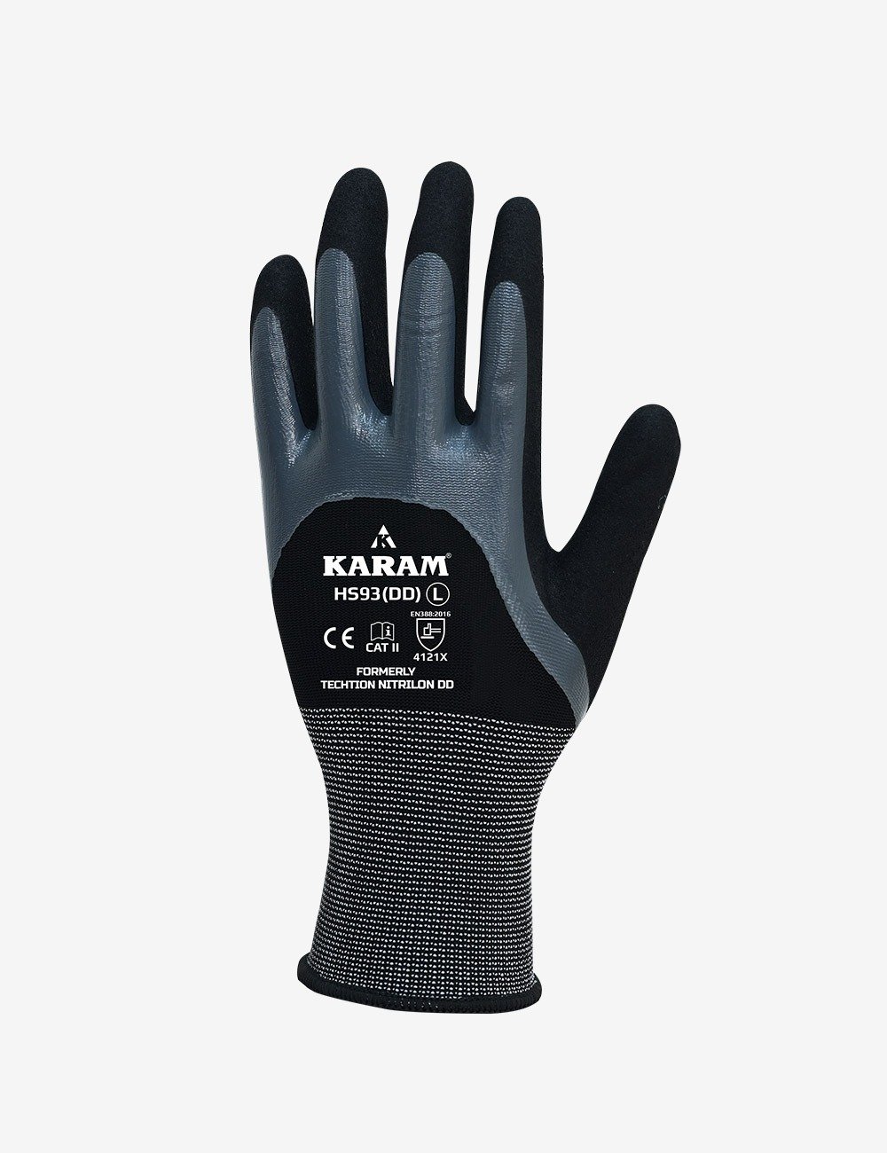 The HS 93 (DD) glove provides superior hand protection with over 70% back coverage and a fully coated thumb. Its double-layer nitrile coating keeps hands dry when handling oily components. A 15-gauge soft liner ensures comfort and high fingertip sensitivity, while the sandy nitrile palm offers outstanding grip. Designed with a modern grey and black finish, the glove is ideal for professionals in demanding environments.