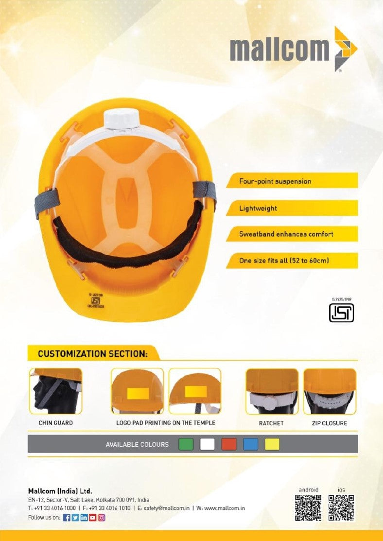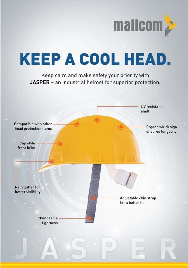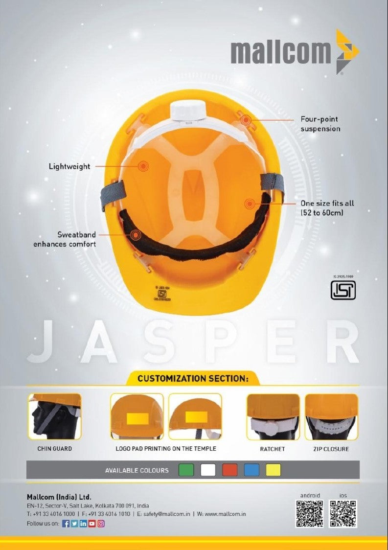 Mallcom Jasper XIV non-ventilated zip adjusted Industrial safety helmet with PP shell, LDPE harness & chin strap.