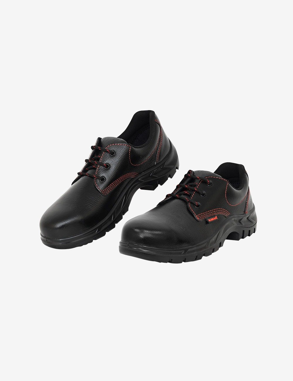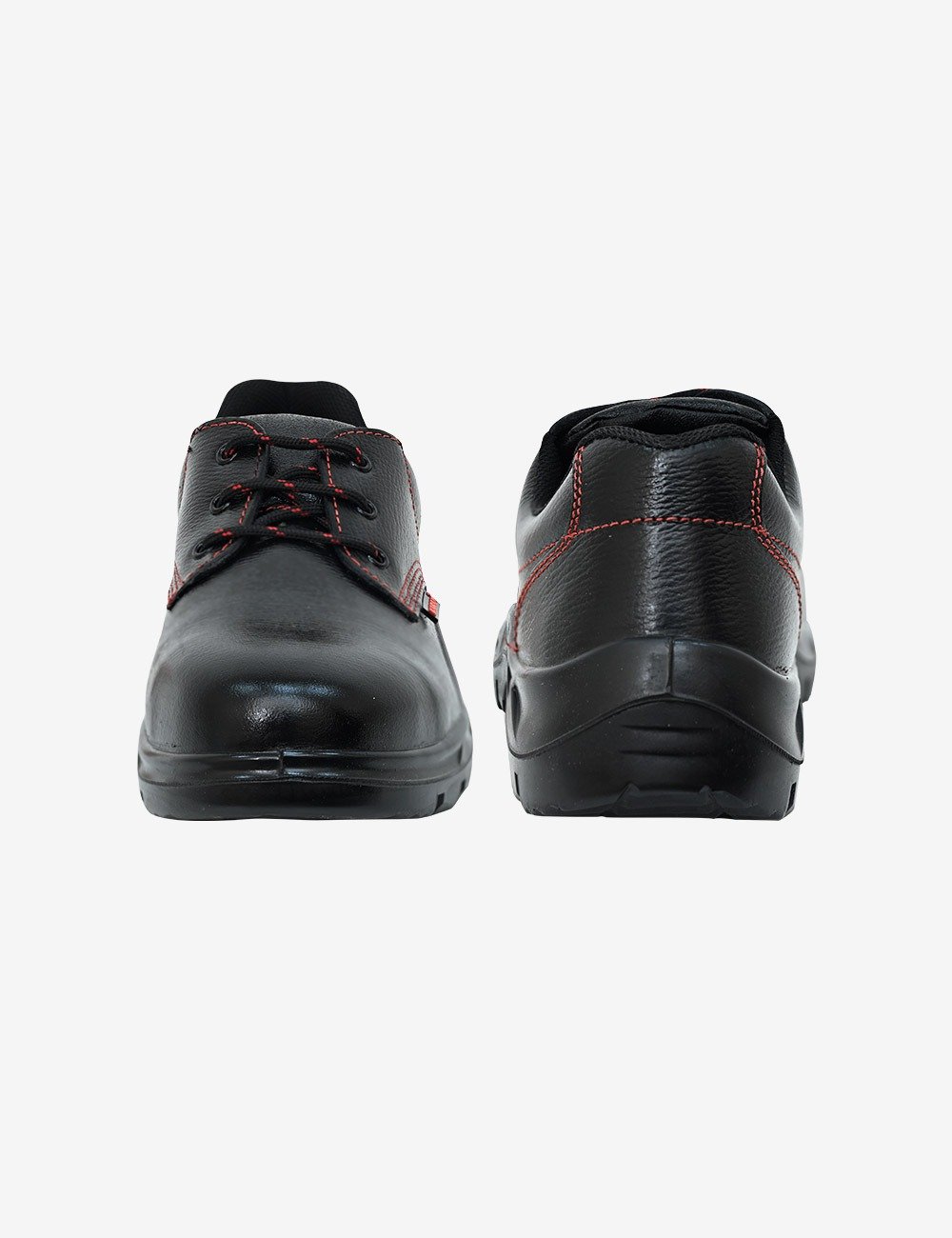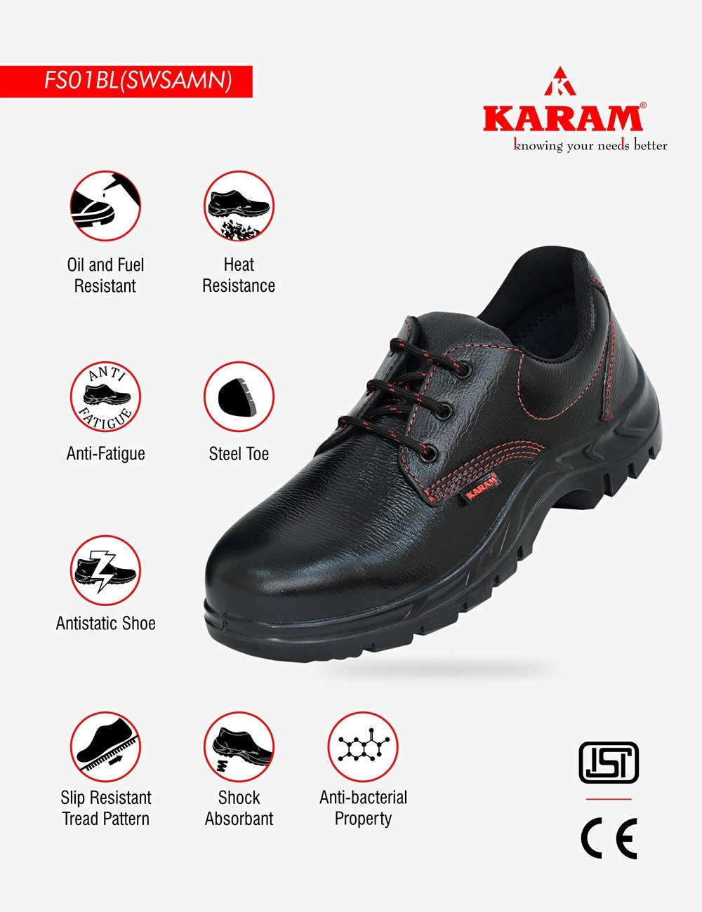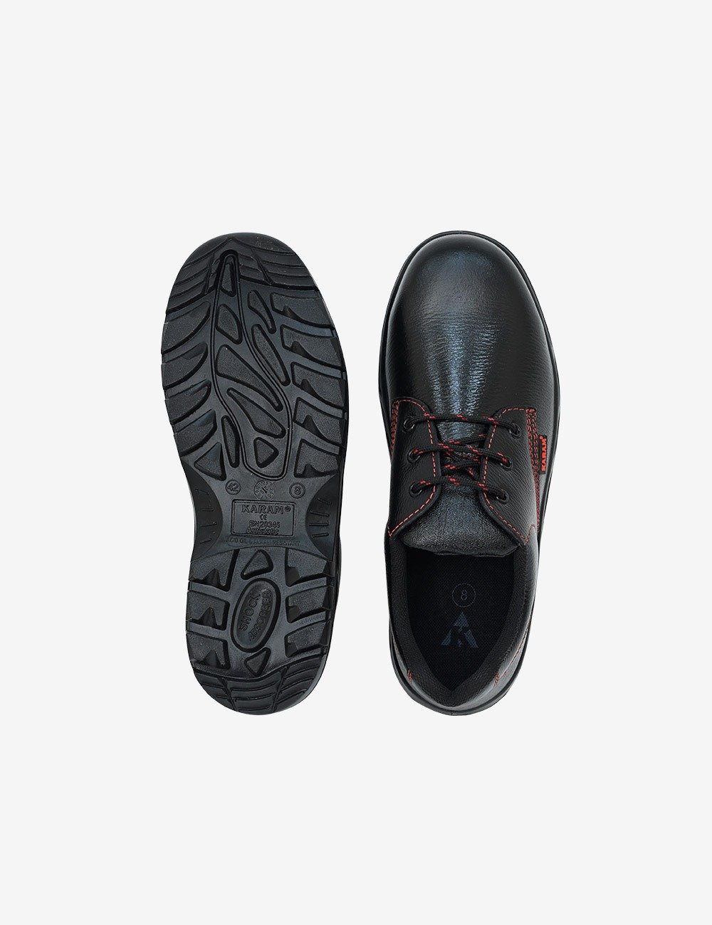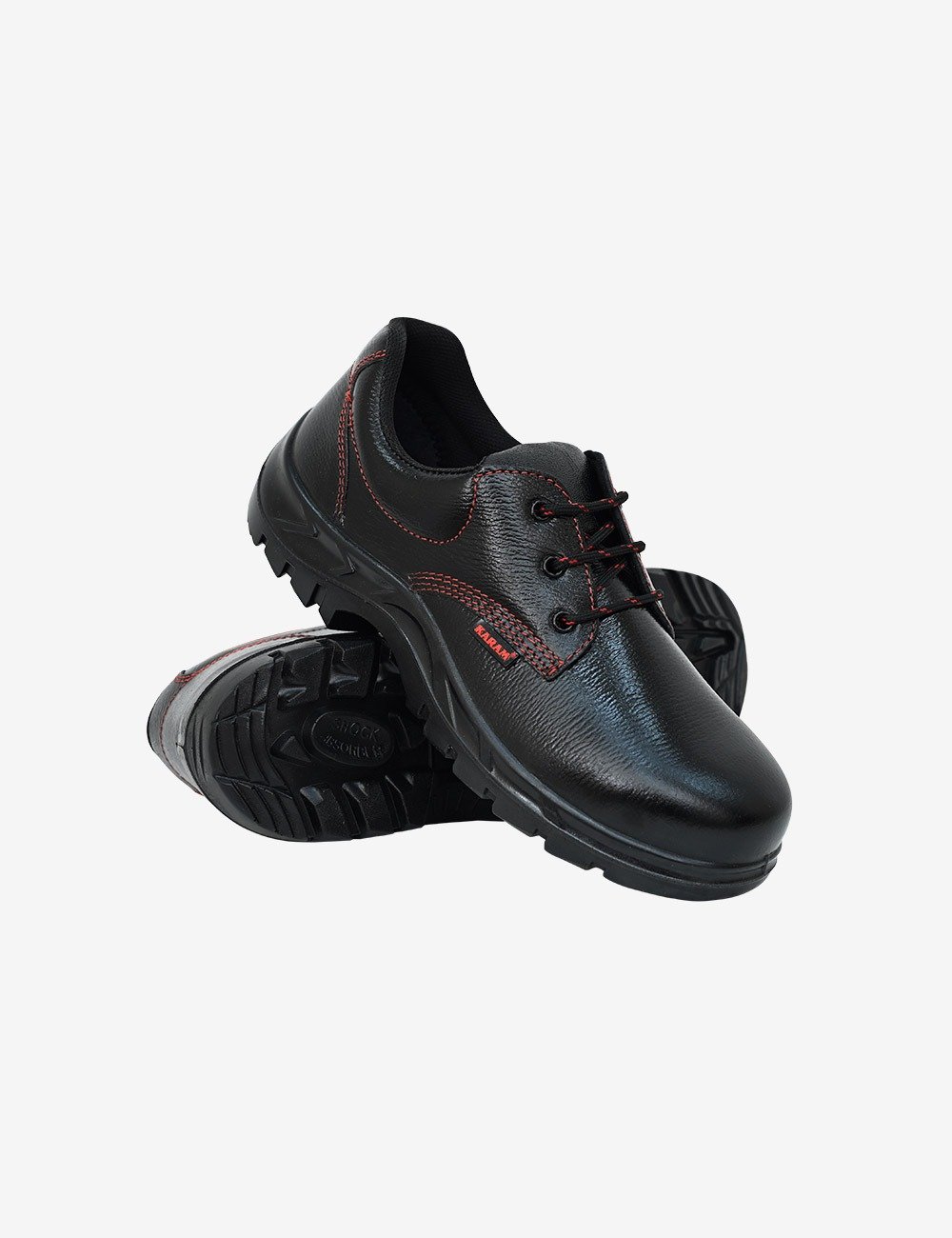 FS01BL(SWDAPN) safety shoes features a carbon steel toe for impact protection, while its lightweight design ensures durability and superior shock absorption. Smart red stitching with bonded thread adds a stylish touch. With excellent grip, comfort, and heat resistance, these safety shoes from KARAM’s range with double-density PU/PU soles offer optimal shock absorption.