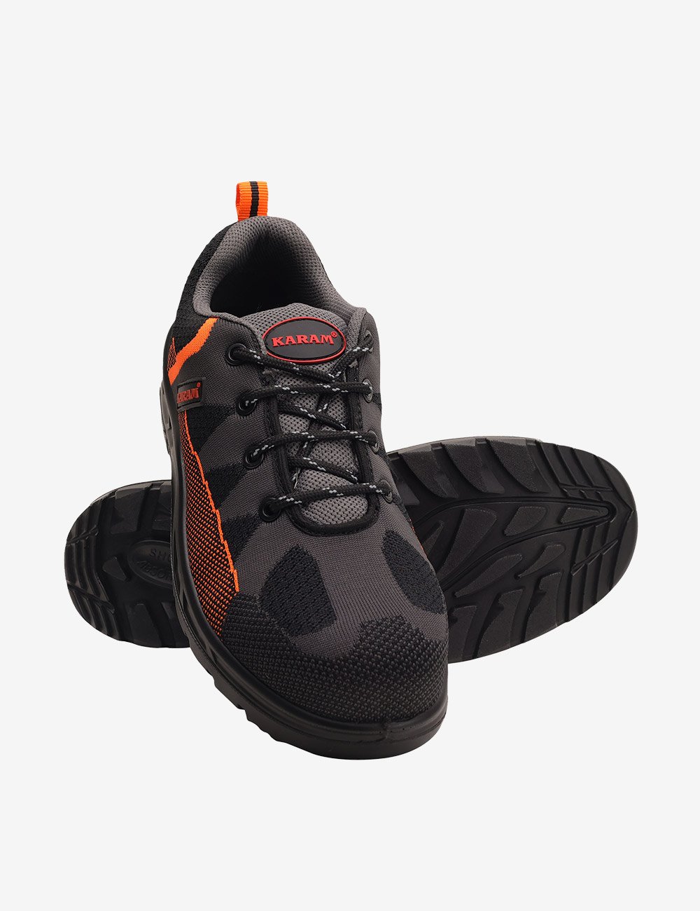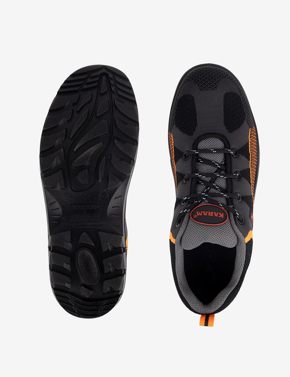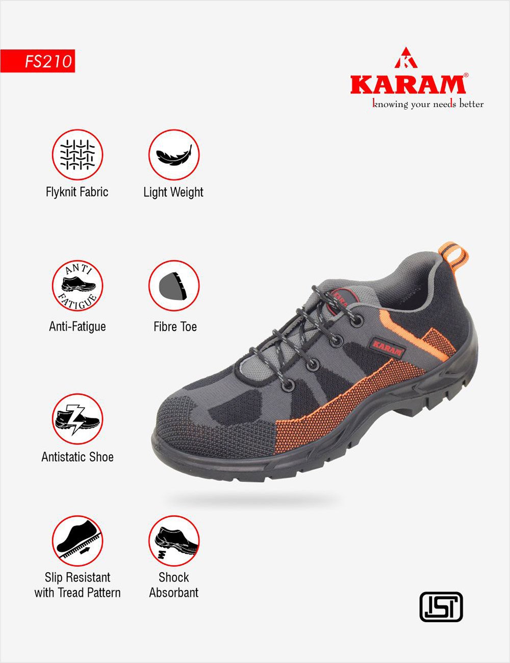 Flytex FS210FN(FWSAMN) safety footwear equipped with all the significant features to ensure safety against extreme odds and to facilitate comfortable walk and work and the range is a perfect blend of breathability, comfort, safety and style. Black flyknit upper safety footwear with a protective fiber toe cap and drylex orange lining. The safety shoe has a single density black PU sole which is anti-static, anti-slip, & heat resistant.